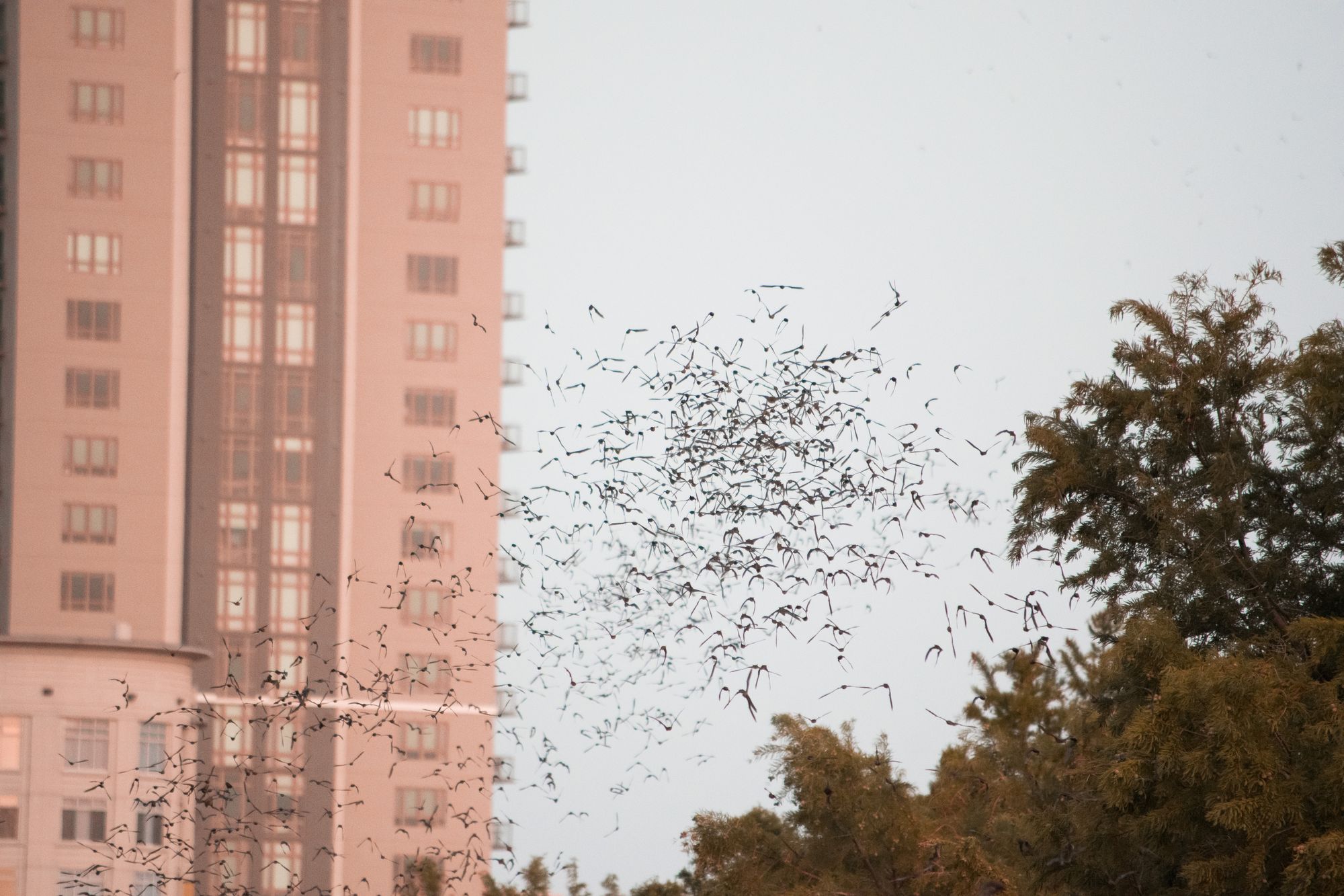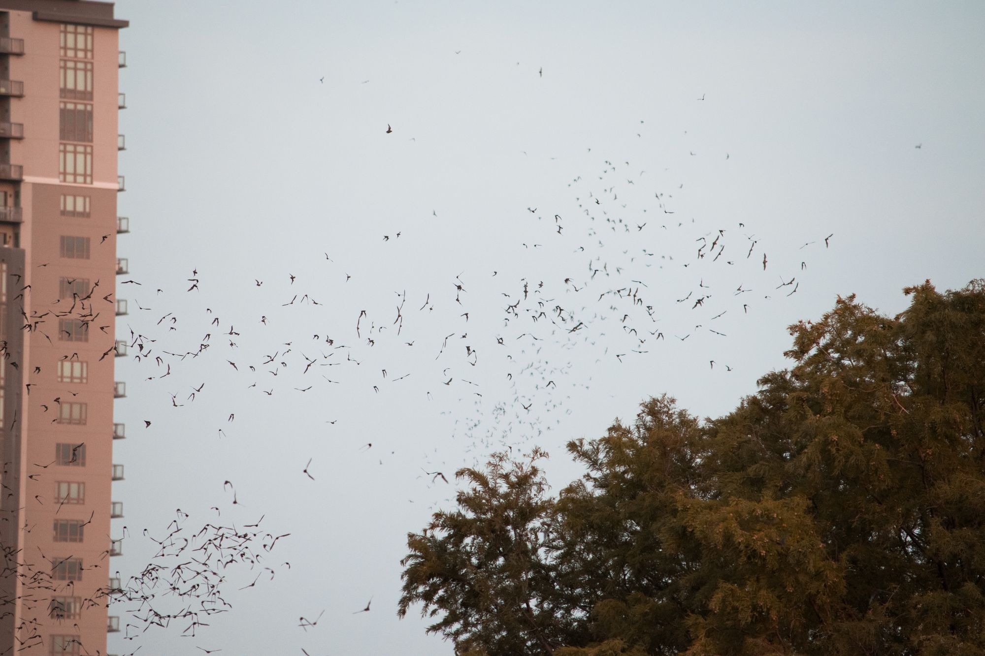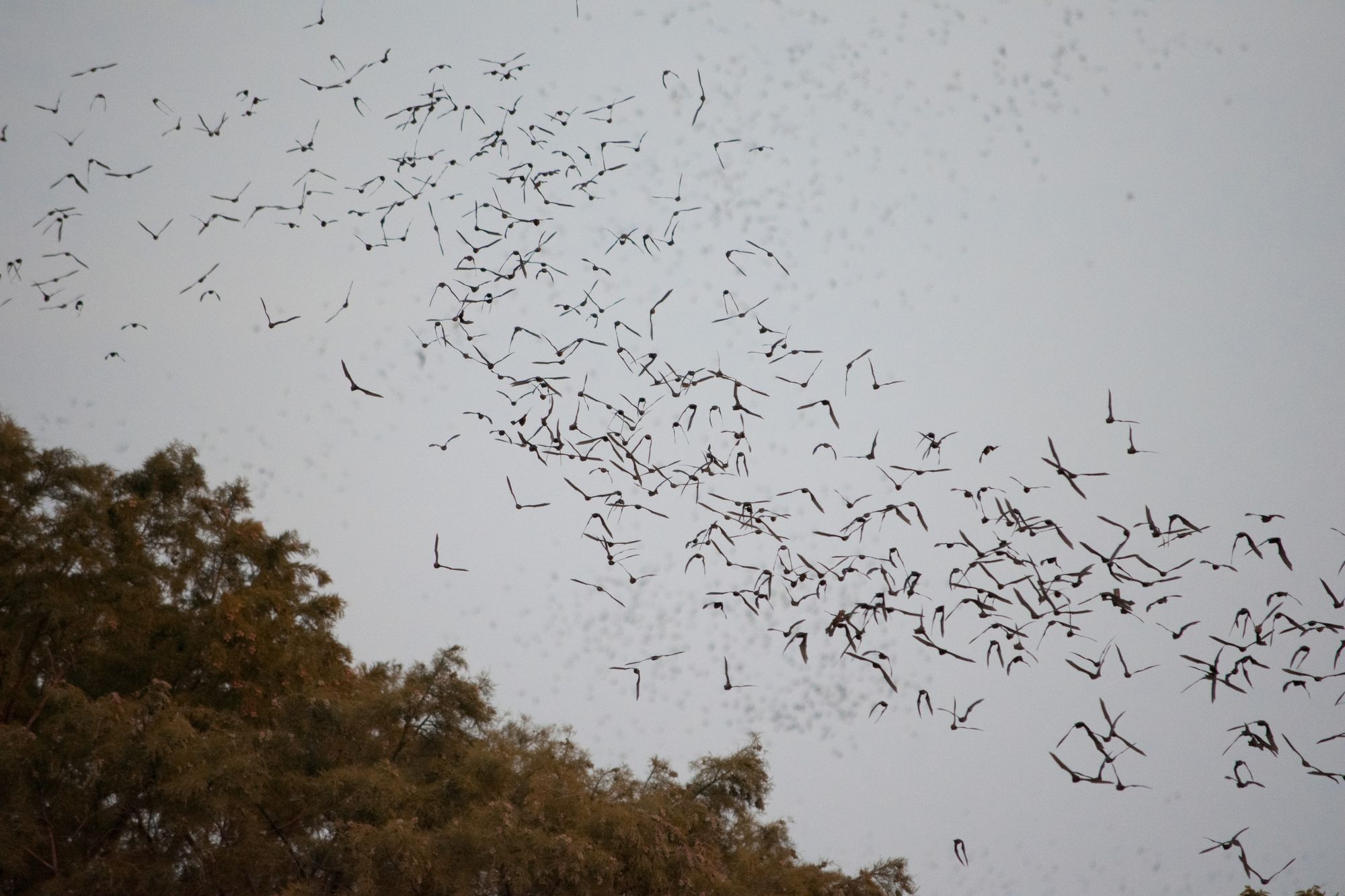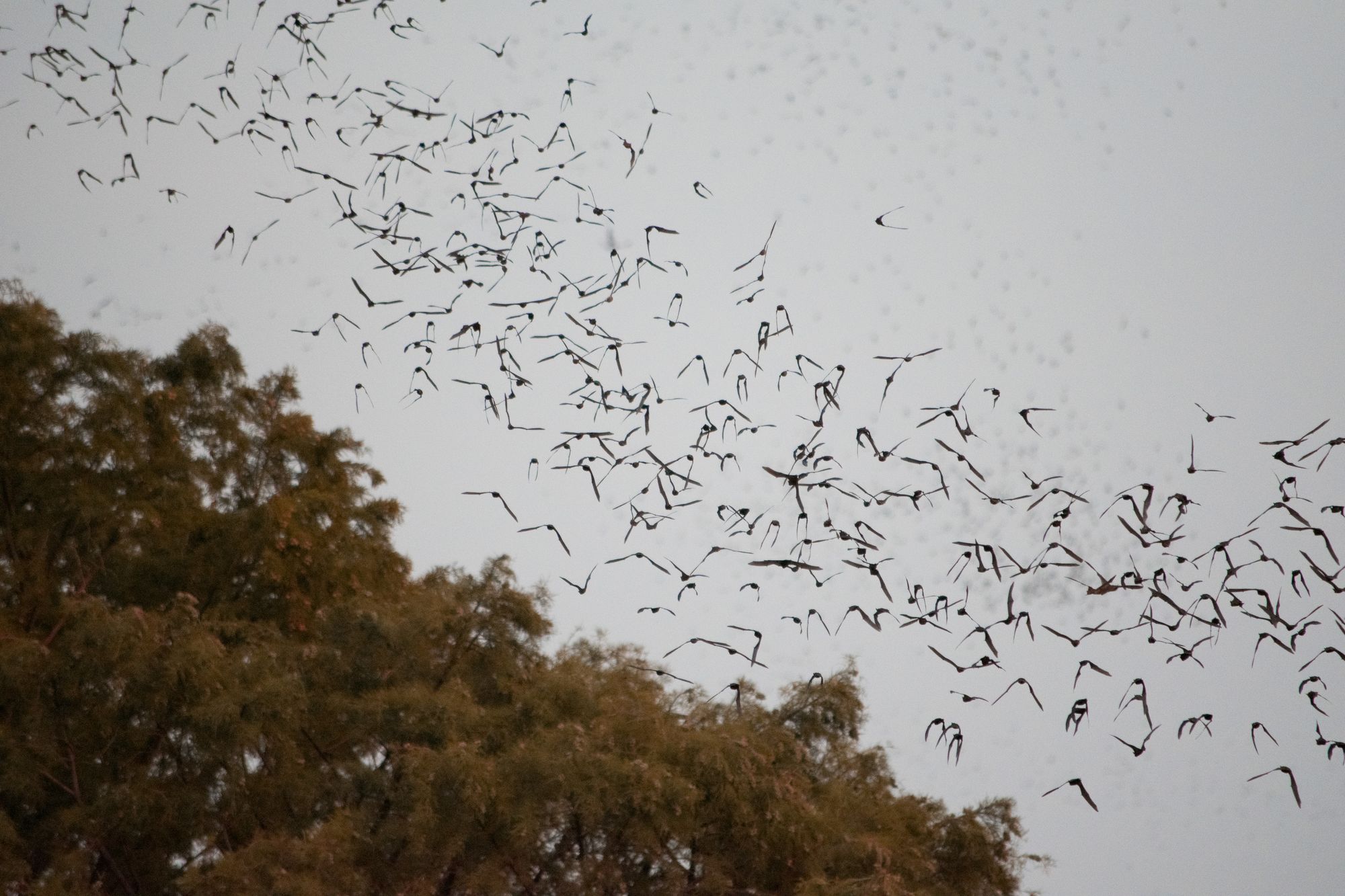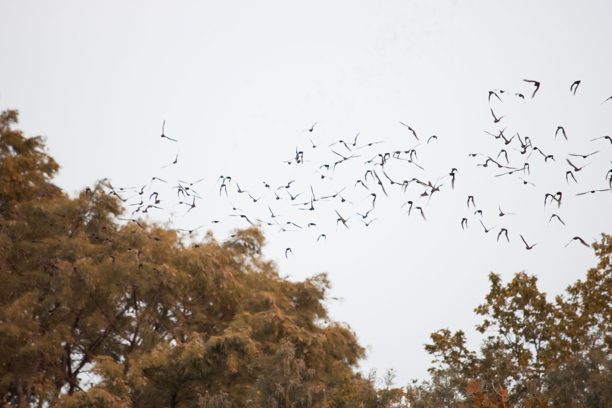 Here you can see the first wave of bats leaving the bridge and following the treeline.