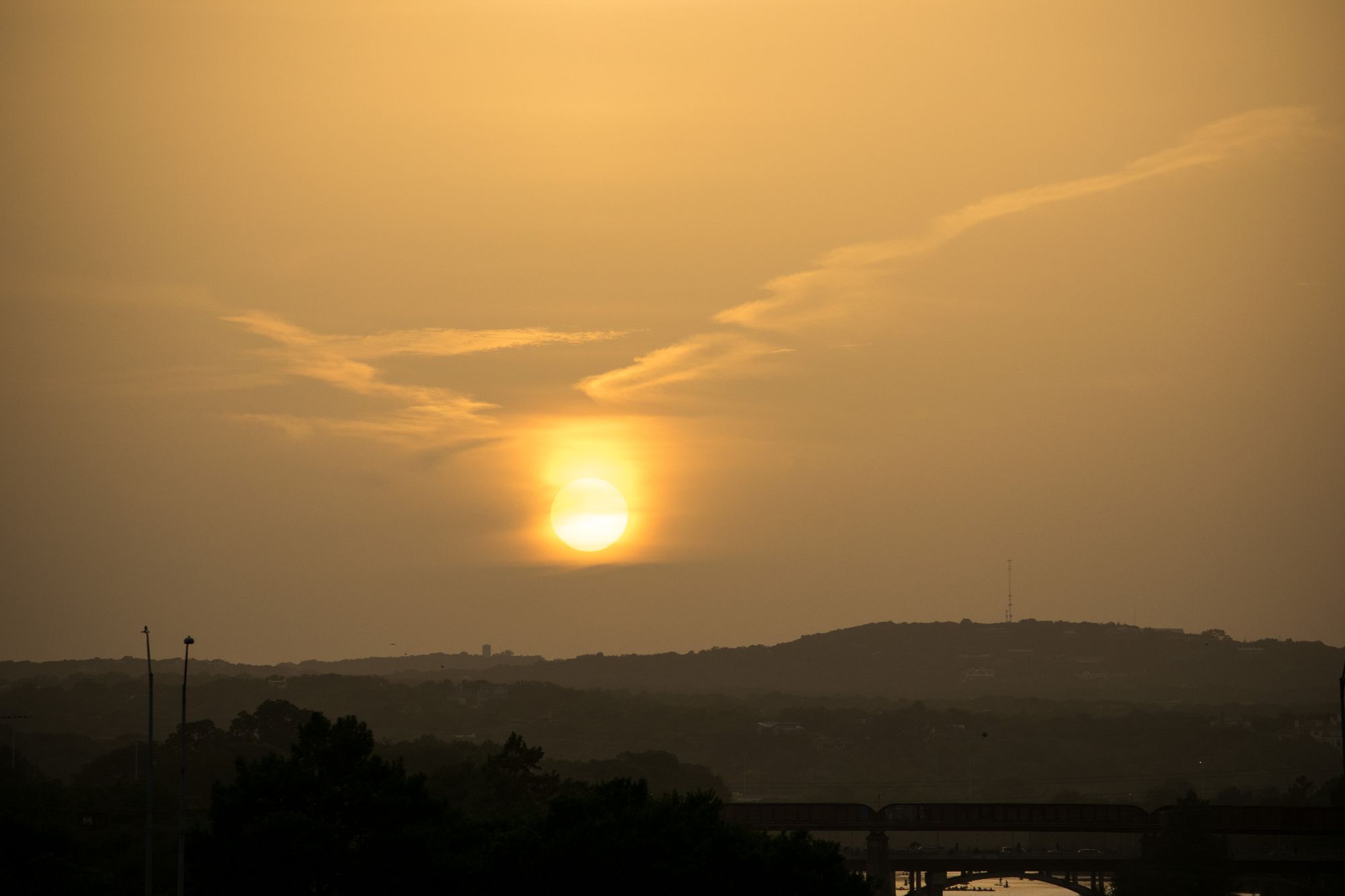 As the sun set, the sky turned a beautiful shade of yellow on the other side of the bridge.