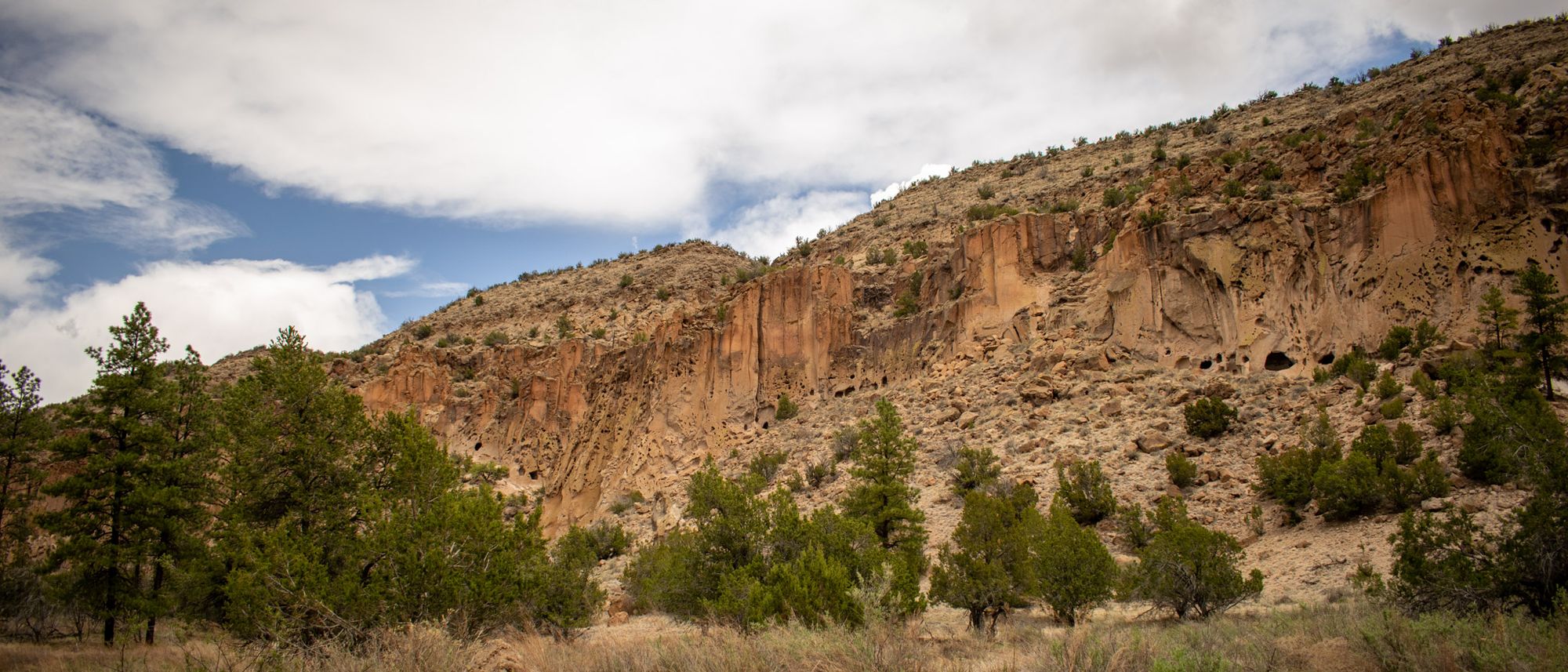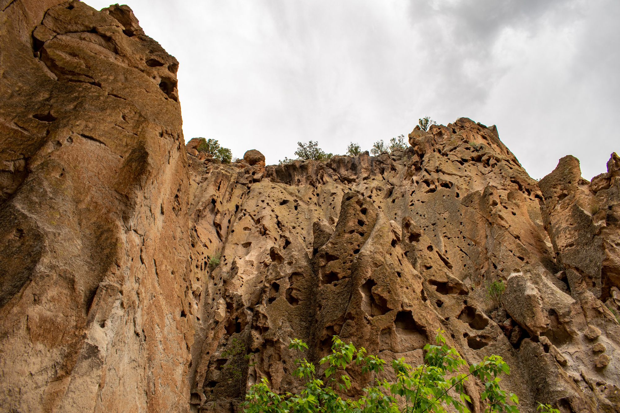 Once we began the ascent and got closer to the cliff walls, we could see more clearly the interesting erosion of the tuff, which is a type of volcanic rock that populates the walls of the valley. The rock type that make up Bandelier include tuff, obsidian, pumice, and basalt for the most part. Pictured below is a close up view of the cliff walls; you can clearly see the porous rock and unique shapes that would make it easy to expand into a dwelling space.