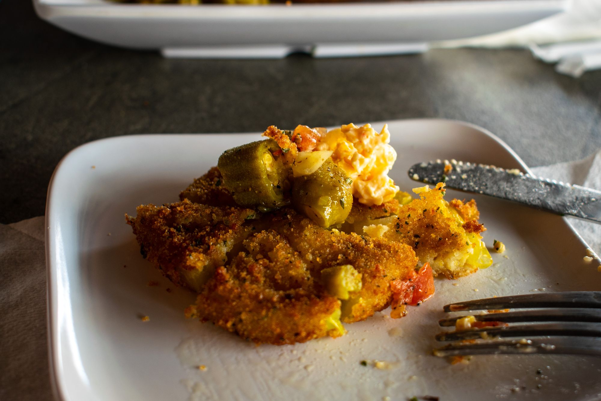 After a busy day for the books, my mom and I enjoyed blissful sleep and an "afternoon breakfast" over at Page's Okra (thank you to the man on the plane for your recommendation). Page's was an easy five-minute walk from our place in Mount Pleasant right off Coleman, where we treated ourselves to delicious fried green tomatoes (topped with pickled okra and homemade pimento cheese) and sweet fried chicken sandwiches.